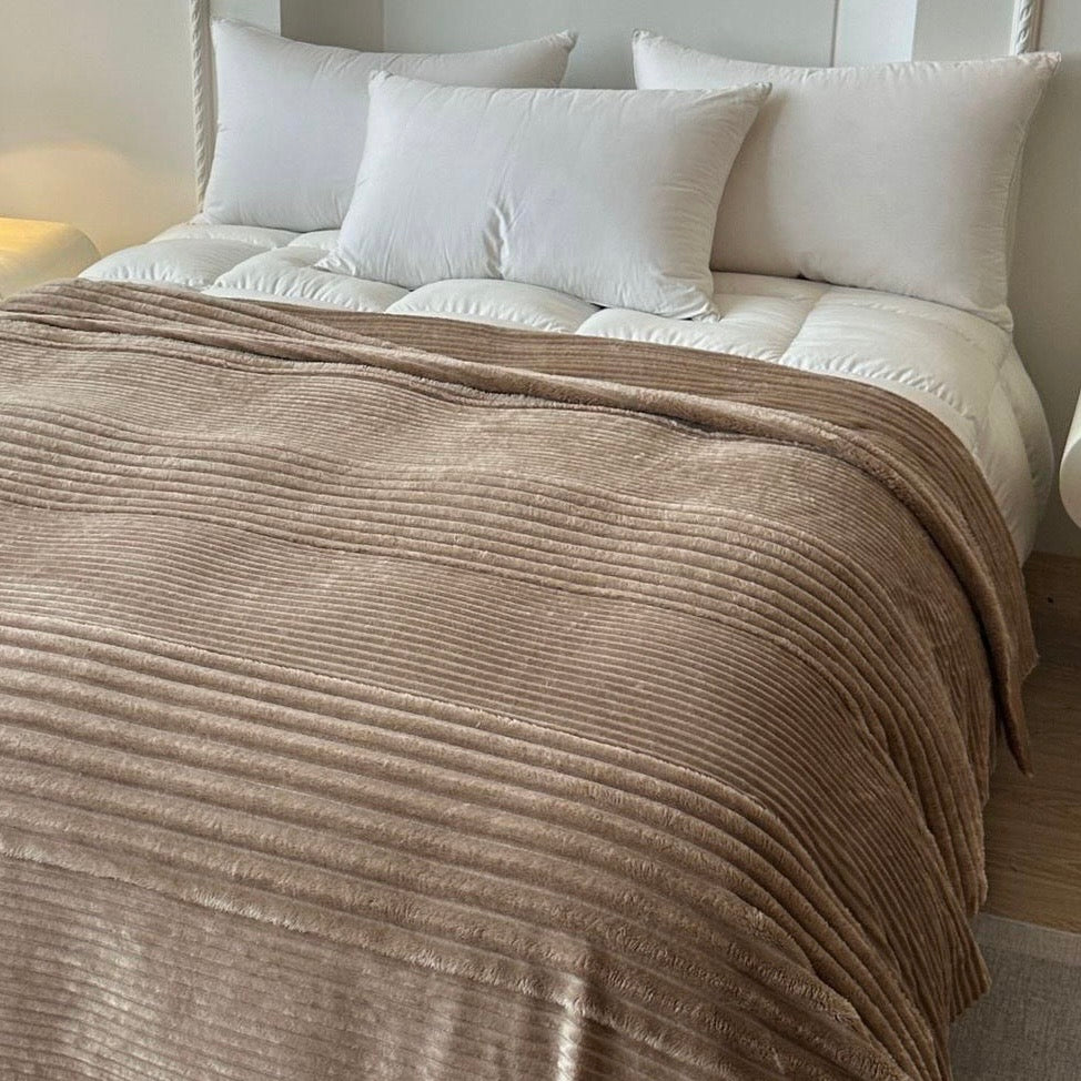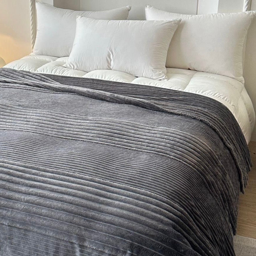 Eleva la calidez de tu cama con nuestro Cobertor Stripes de Microplush, una pieza que combina textura, suavidad y diseño minimalista. Su superficie con finas líneas acanaladas aporta un efecto visual sutil y elegante, mientras su tejido ultra suave brinda una sensación de confort inigualable.