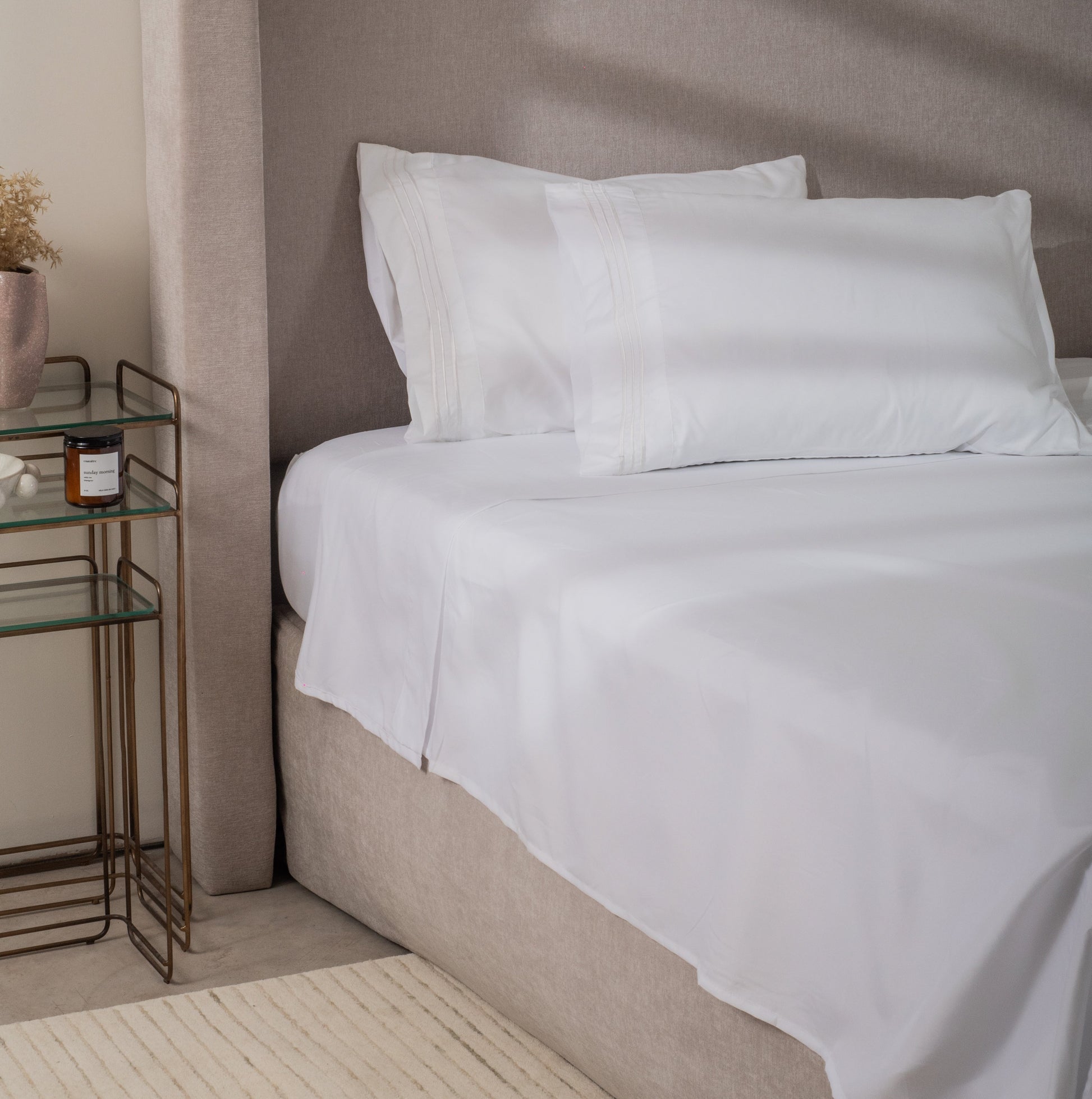 El set incluye sábana de cajón, sábana plana y fundas de almohada, con un diseño limpio y elegante.