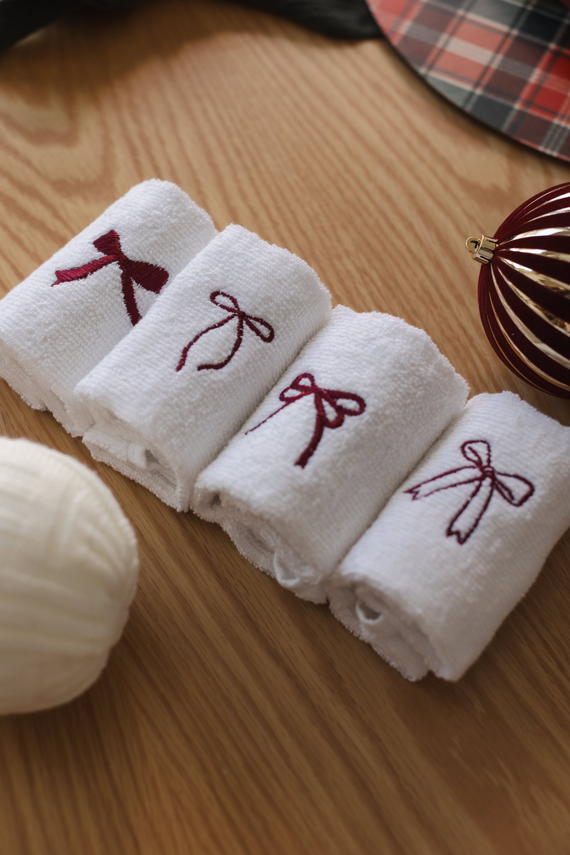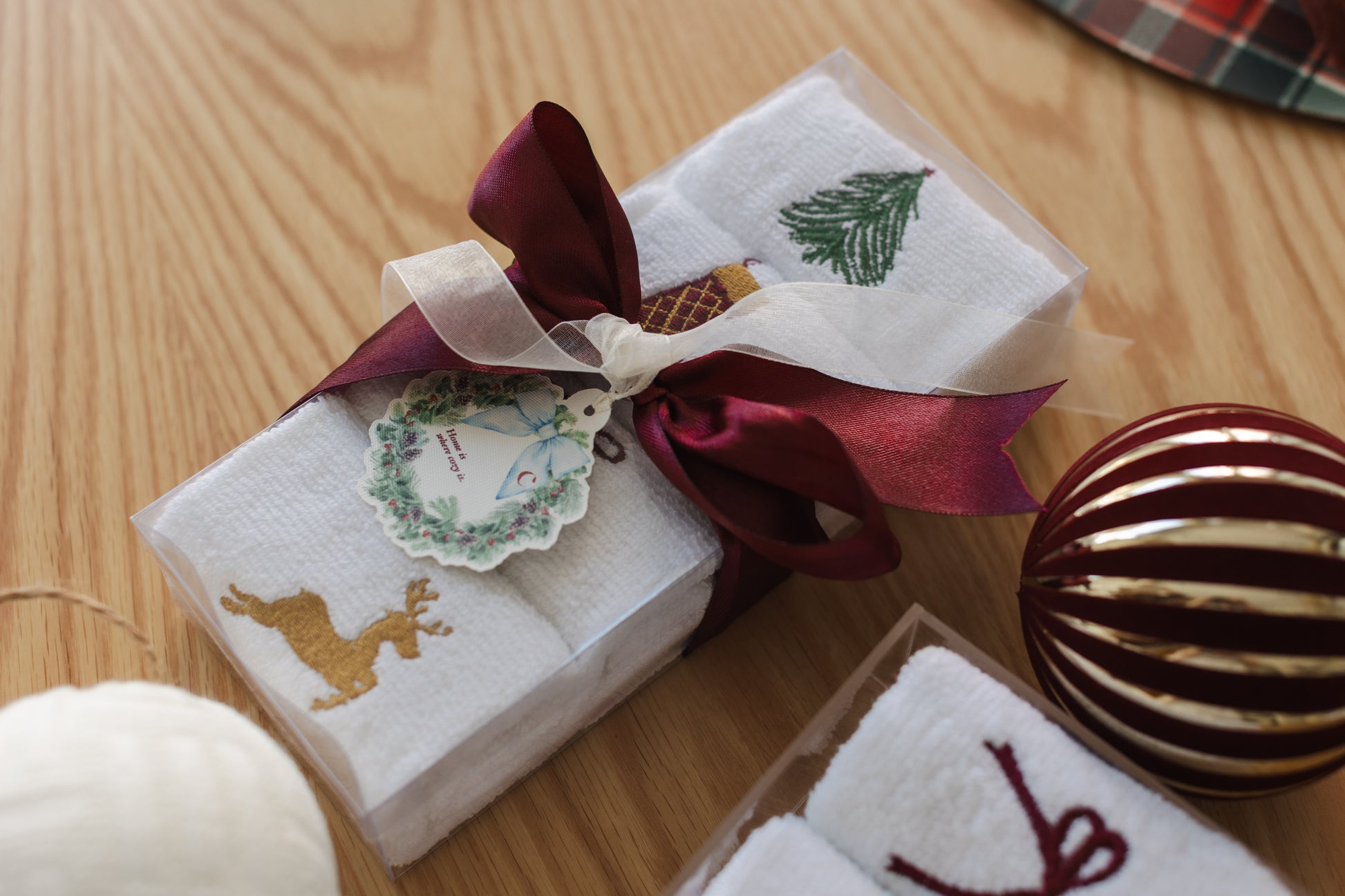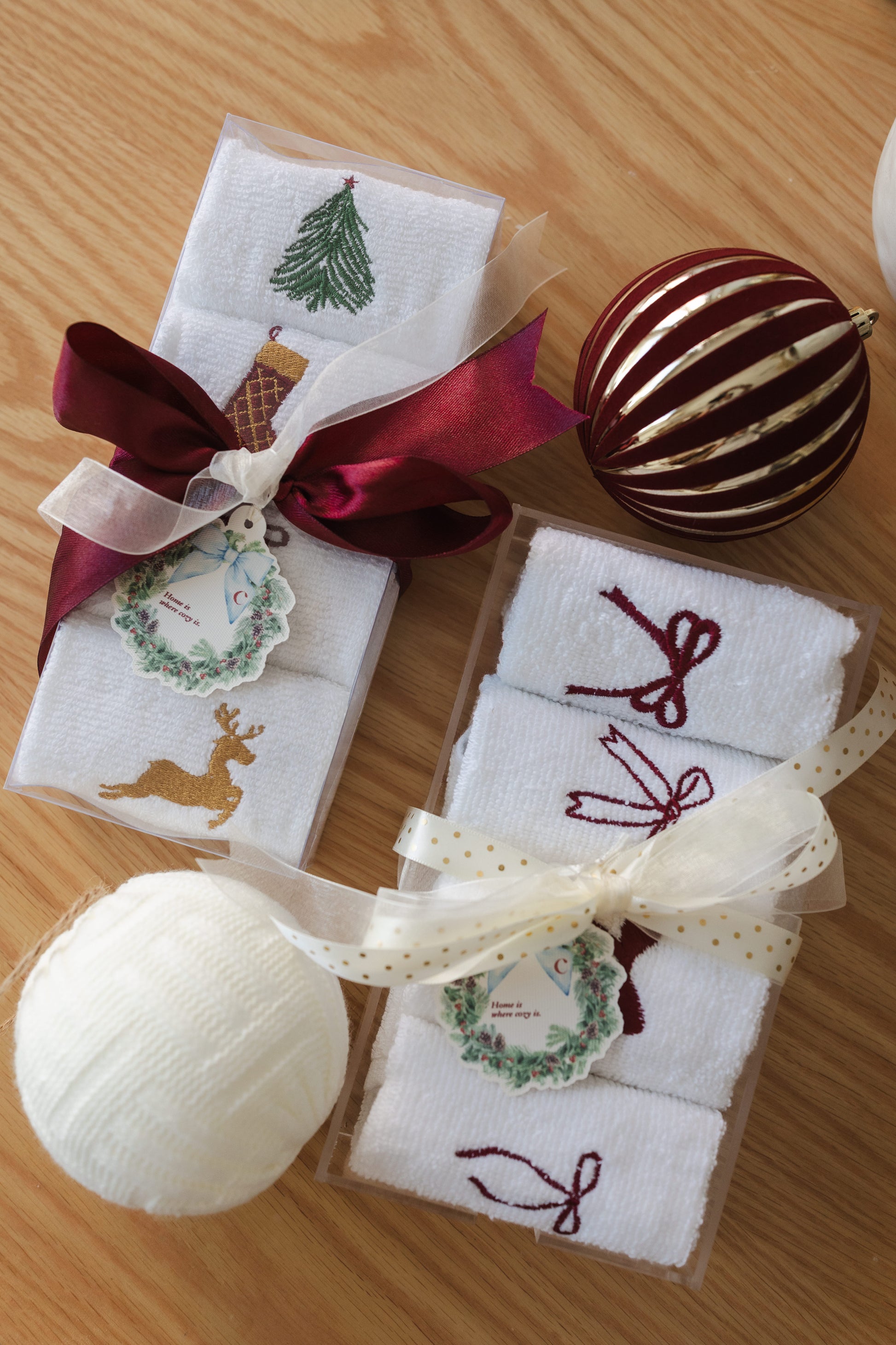 Set de 4 toallas 100% algodón de medida 30x30 cm bordadas con diseño navideño, se entregan en caja de acetato con moño listas para regalar. Si quieres agregar caja de acrílico +$150