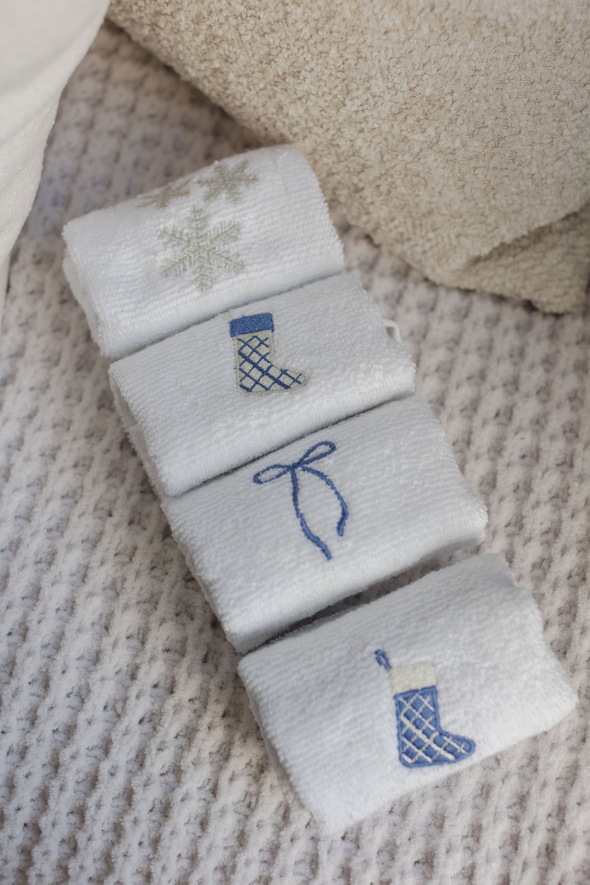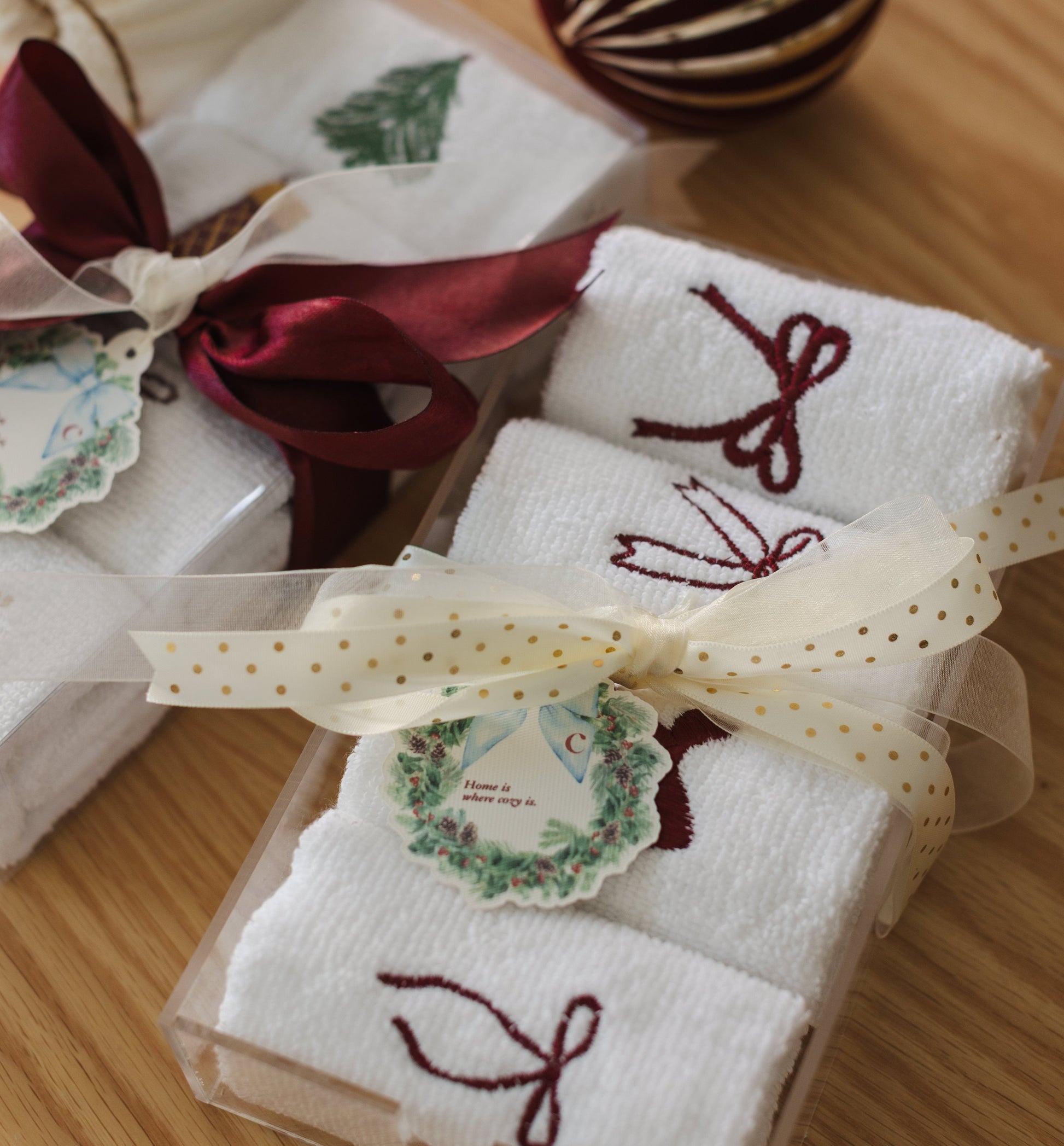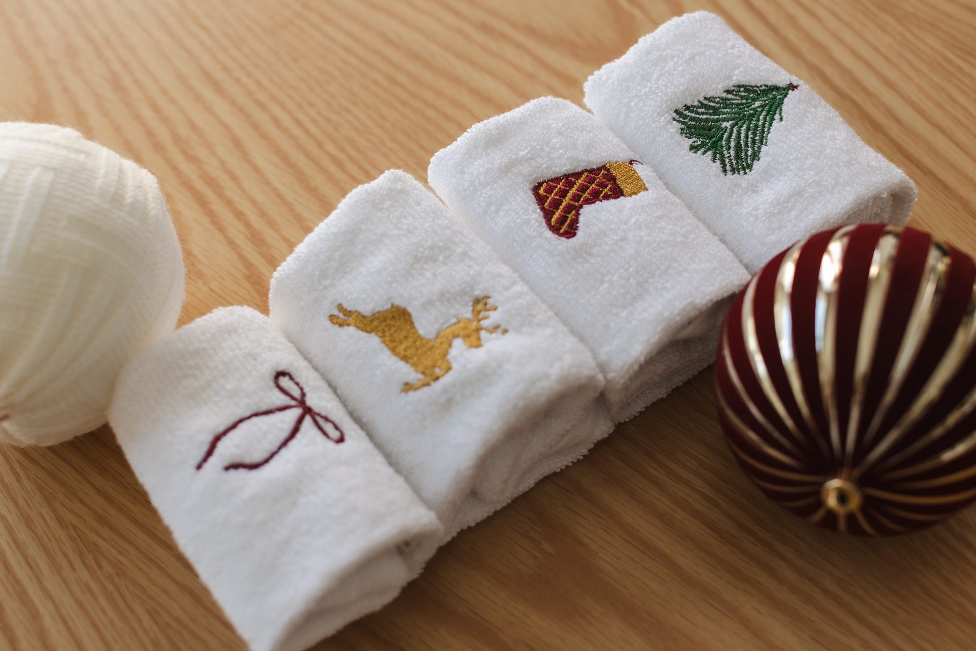 Set de 4 toallas 100% algodón de medida 30x30 cm bordadas con diseño navideño, se entregan en caja de acetato con moño listas para regalar. Si quieres agregar caja de acrílico +$150